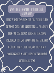 Hi there, if you are new here or already know me, I’m Kelsey. A licensed therapist with a renewed passion for books. In the past year, I have heard from multiple clients, friends, etc. that mental health books can feel like a lot to process alone. Hence, therapeutic book club! Unlike a traditional book club that focuses mainly on themes, characters, and storylines, a therapeutic book club creates space to reflect on personal experiences, emotions, and patterns that arise from the book’s content. Together, participants will process insights in a safe, supportive environment, with guidance from me.